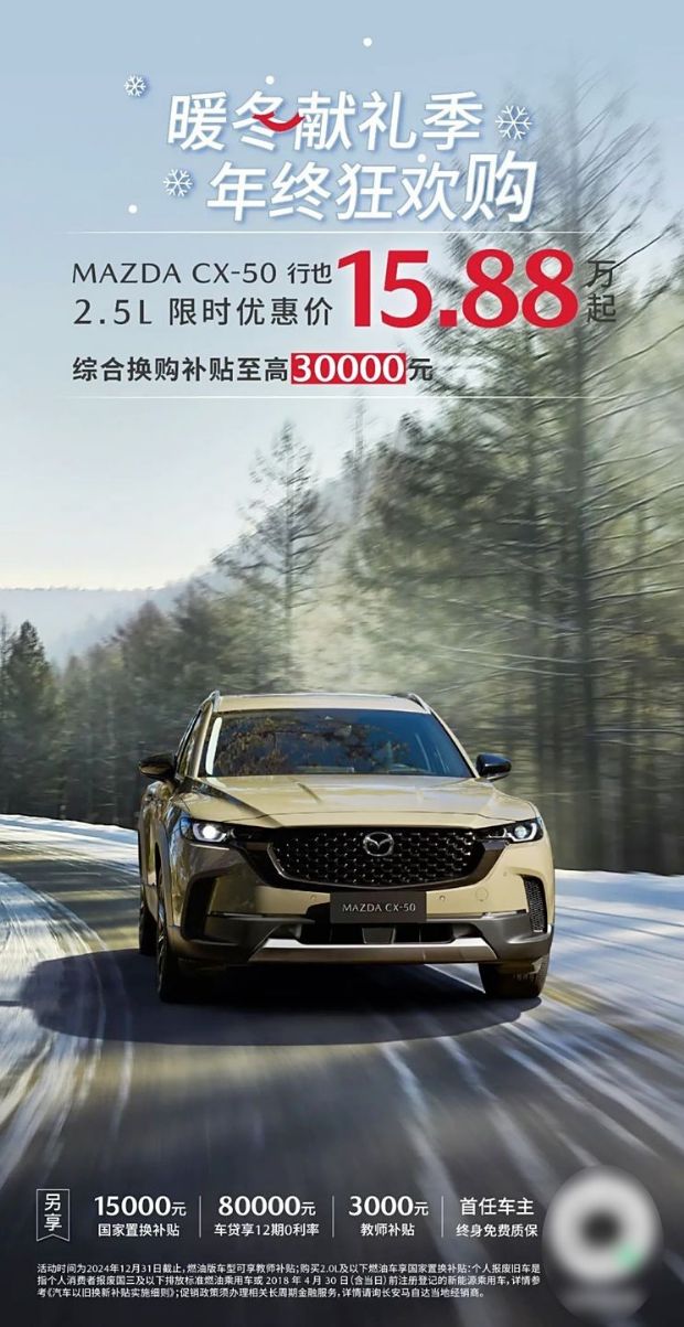 马自达CX-50行也2.5L限时售价15.88万起(2.5L指导价17.58万起),综合换购补贴最高3万。同时,购买该车还可享1.5万国家置换补贴、3000元教师补贴、首任车主终身免费质保等购车权益。
