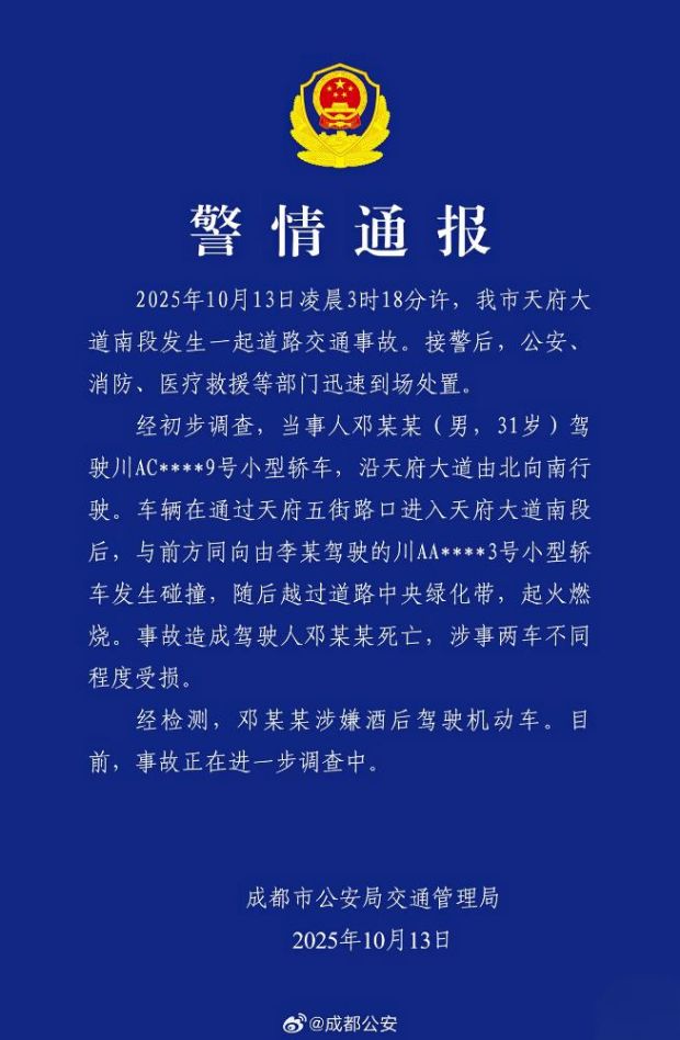 通报显示,31 岁的当事人邓某某驾驶川 AC***9 号小型轿车,沿天府大道由北向南行驶。在通过天府五街路口进入天府大道南段后,车辆与前方同向由李某驾驶的川 AA3 号小型轿车发生碰撞。巨大的冲击力使邓某某驾驶的车辆失去控制,随后越过道路中央绿化带,最终起火燃烧 。此次事故造成驾驶人邓某某死亡,涉事的两辆车也不同程度受损。经检测,邓某某涉嫌酒后驾驶机动车,目前,事故正在进一步调查中。