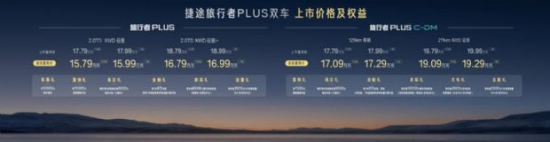 本次上市的捷途旅行者PLUS系列,覆盖“燃油+电混”双动力布局。捷途旅行者PLUS提供2.0TD XWD征服、2.0TD XWD征服+两款配置,官方指导价为17.79万元-18.99万元,超级置换价15.79万元-16.99万元。捷途旅行者PLUS C-DM则推出129km穿越、211km XWD征服两款配置,官方指导价为17.79万元-19.99万元,超级置换价17.09万元-19.29万元。